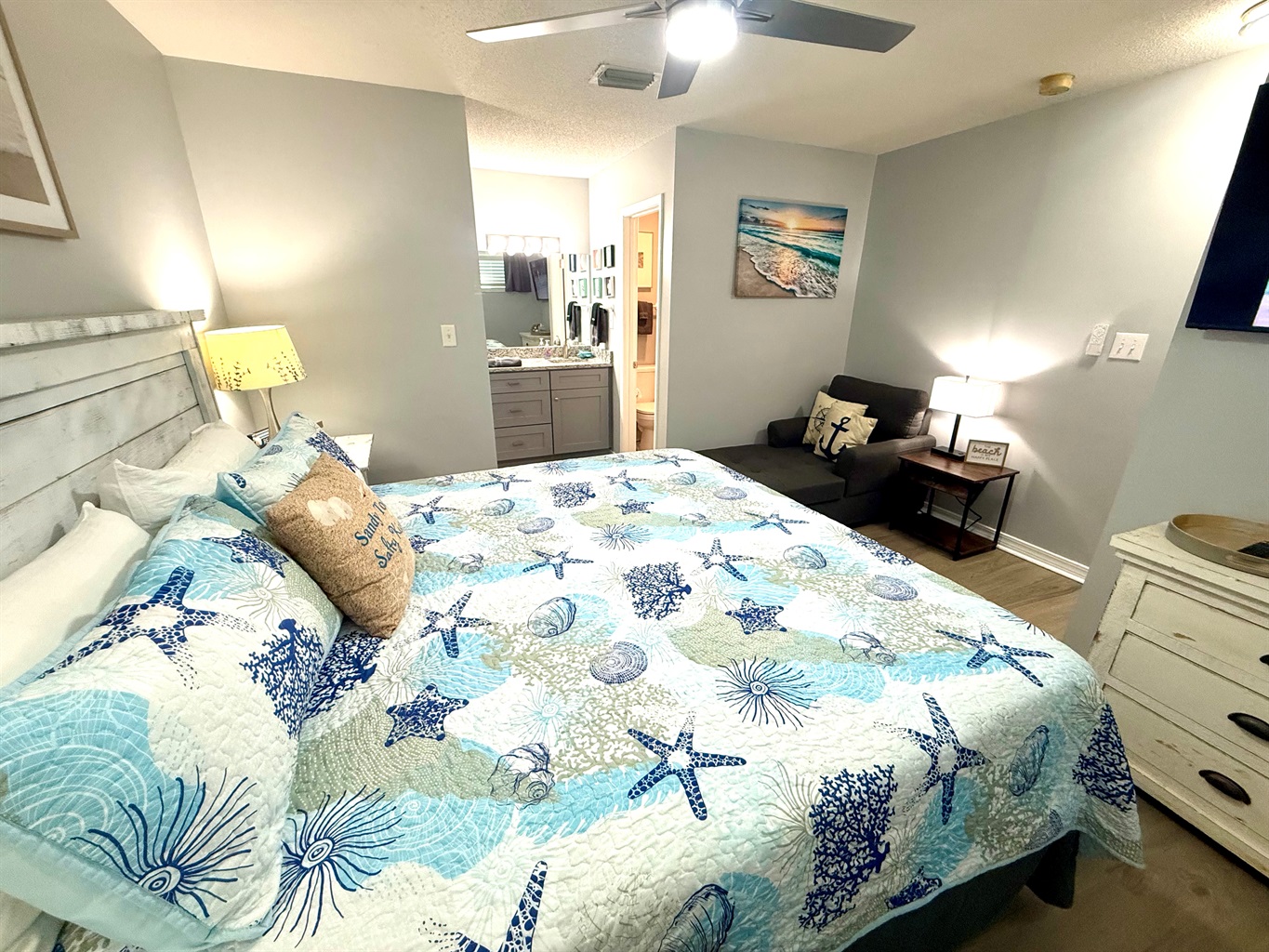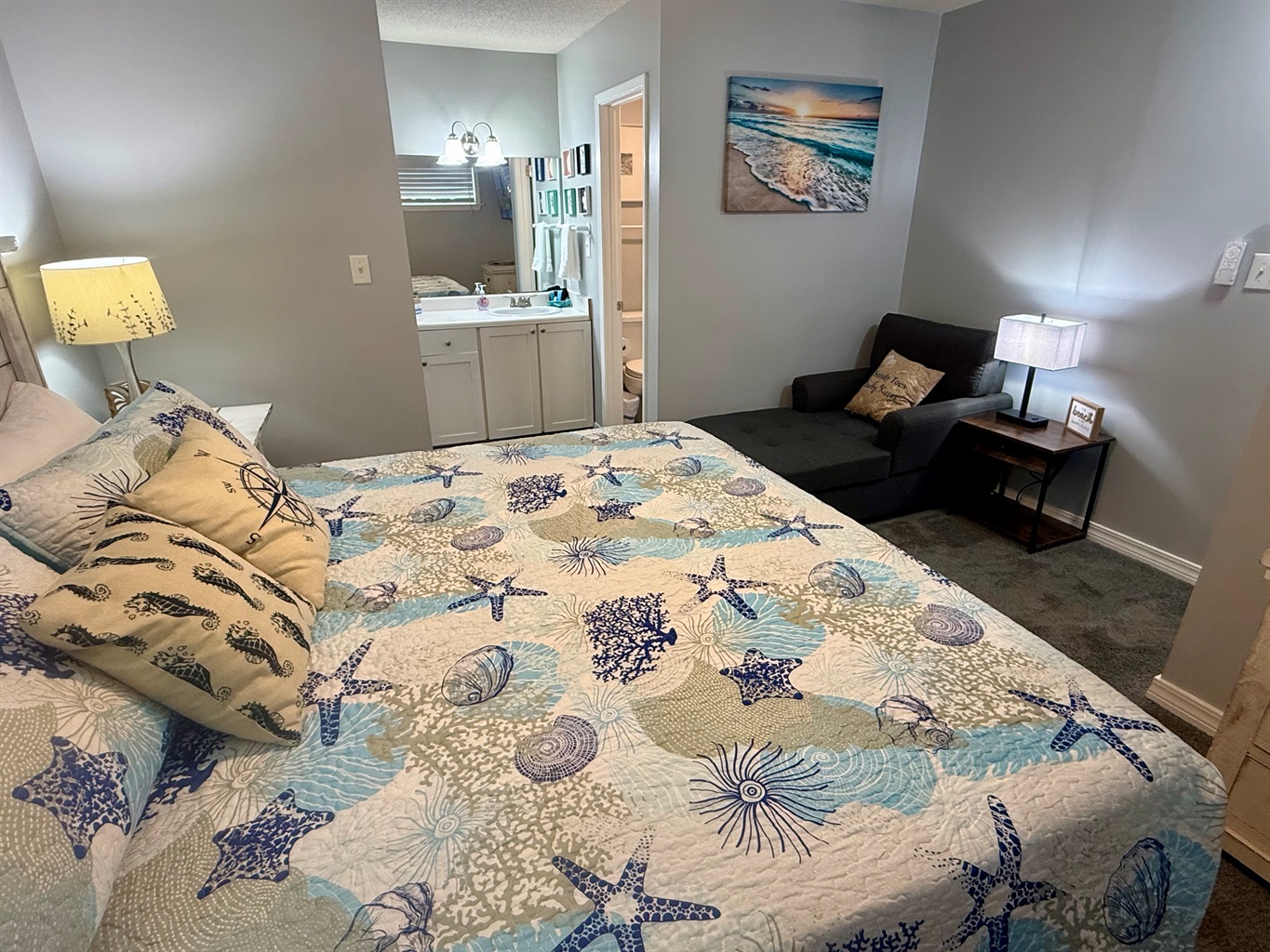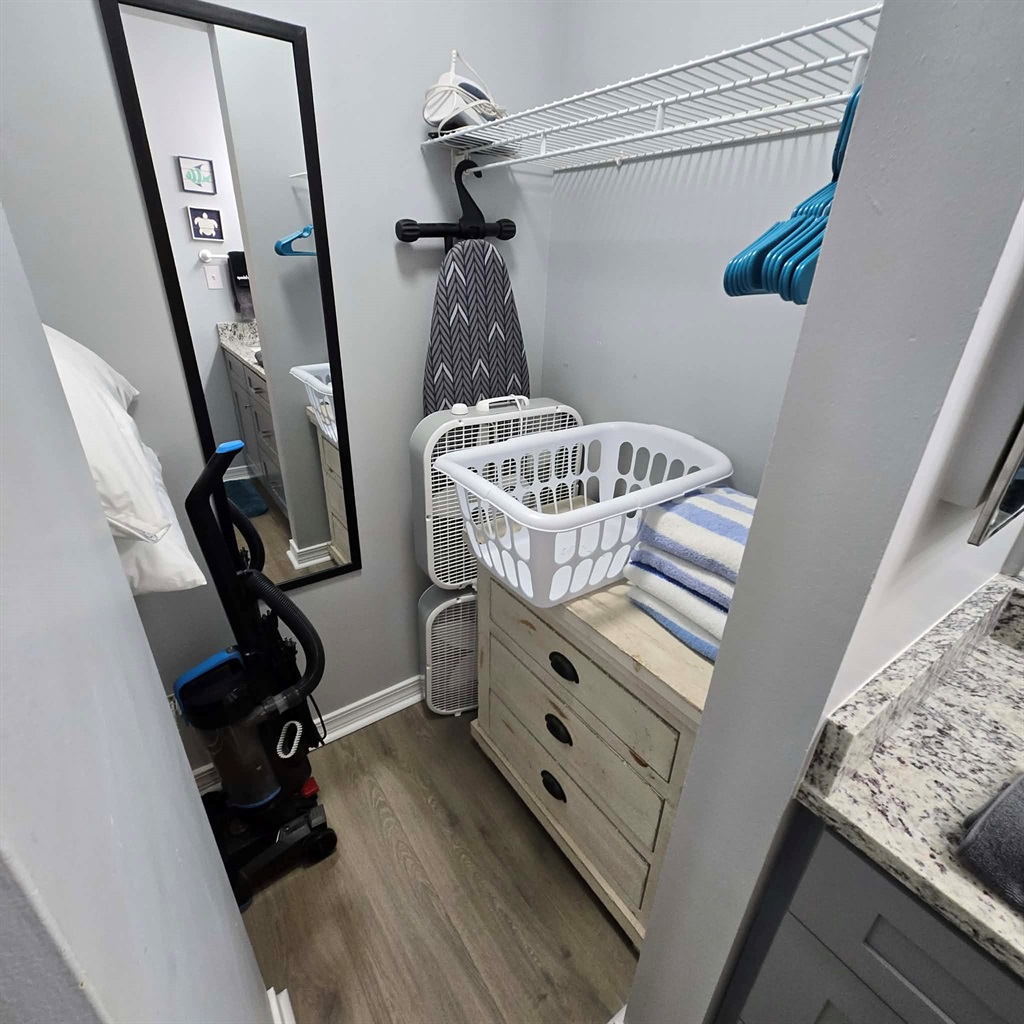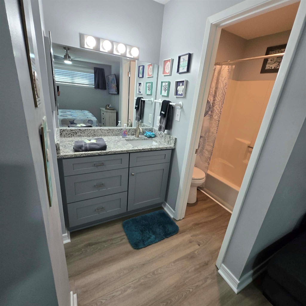 1 Bedroom • 2 Bathrooms 2 Baths • Sleeps 2-4This cozy renovated 1 bedroom/ 2 bath condo is located only steps away from the beach with indirect beach views from your balcony. The eat-in kitchen has all the cooking basics as well as brand new appliances. The living room has a smart TV, comfy chairs and a pull-out sofa. The upstairs bedroom has a king bed, walk-in closet, and smart TV. There is a bathroom on both levels as well as a washer and dryer on the main level.